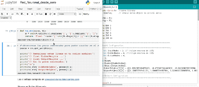 Tengamos en cuenta que estamos teniendo como entradas los datos proporcionados por un sólo sensor de distancia y un servo motor que nos indica si está a izquierda o derecha. Podríamos tener más sensores de distancia, infrarrojos, medir velocidad, luz, sonido… en fin. Si tuviéramos que programar «manualmente» ese algoritmo, tendría una complejidad enorme y sería muy difícil de mantener o modificar. En cambio, hacer que una red neuronal aprenda sería muy sencillo. Tan sólo agregaríamos features (columnas) a nuestro código y volveríamos a entrenar nuevamente la red. Voila!. Copiar y pegar los pesos obtenidos en Arduino, y nuestro coche tendría la inteligencia de manejarse por sí mismo nuevamente.